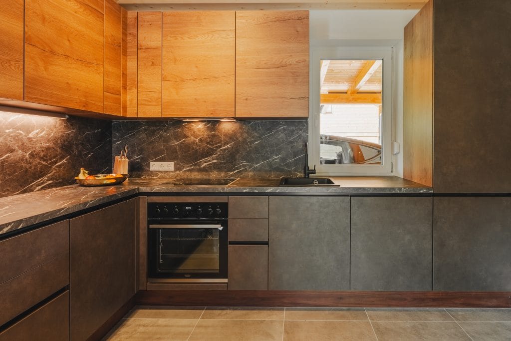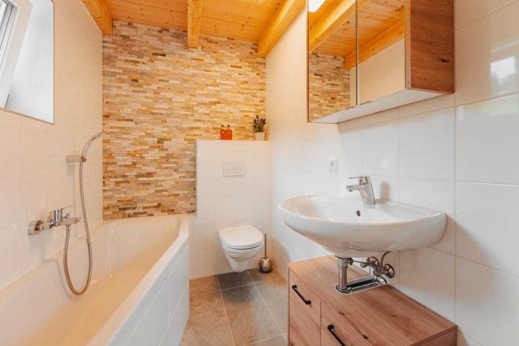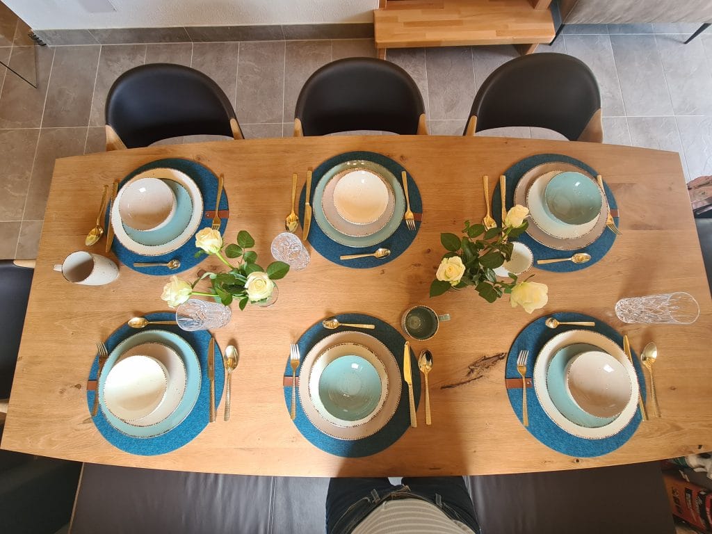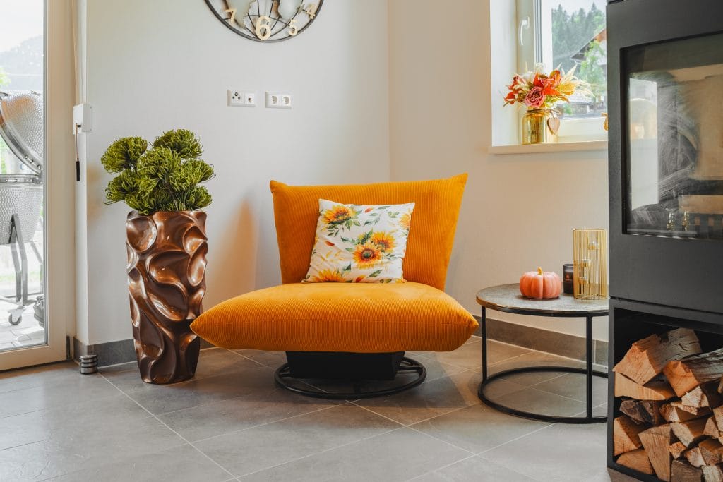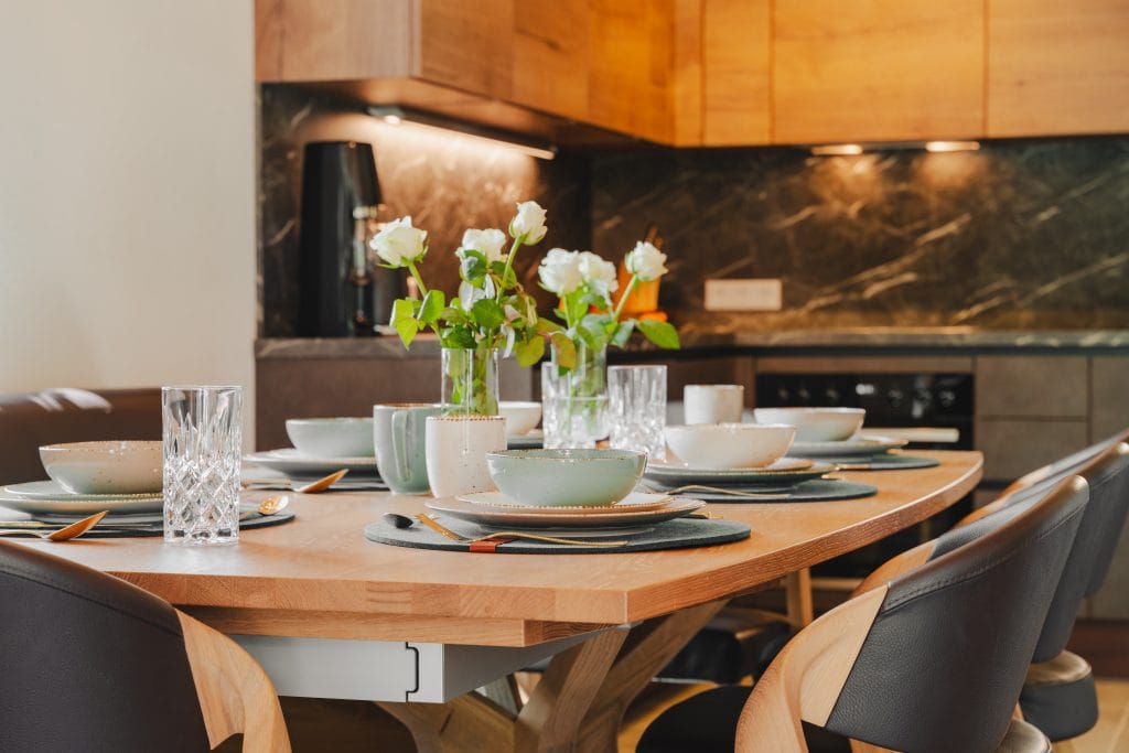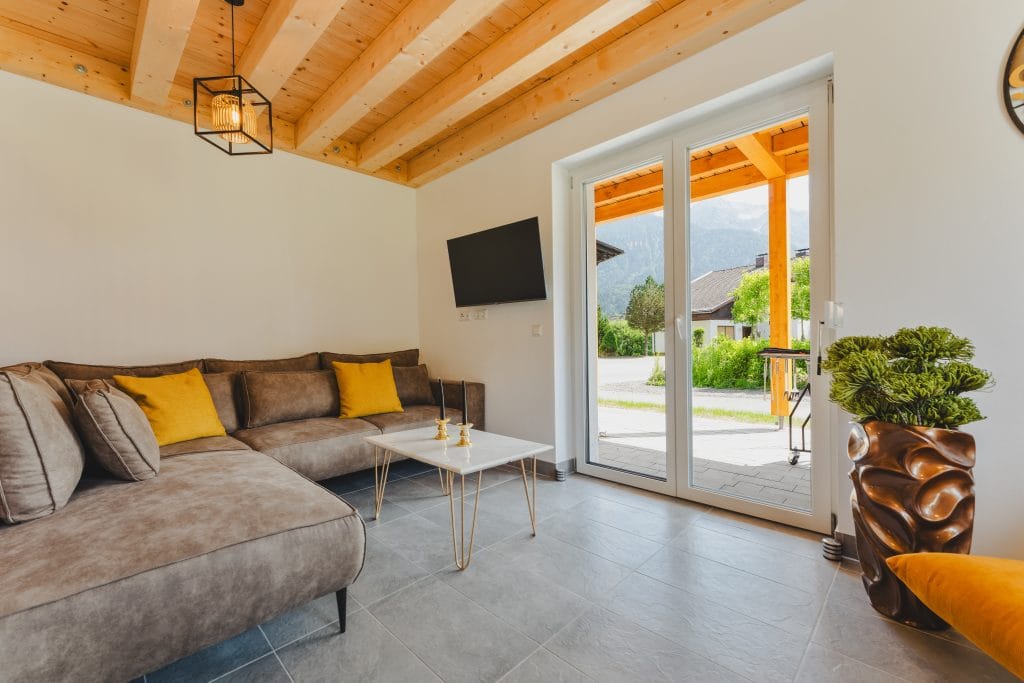 You may find yourself sitting at the modern but typical Austrian style dining area. Also suitable for game nights next to the fireplace. It has a couch, suitable for three people and five chairs.