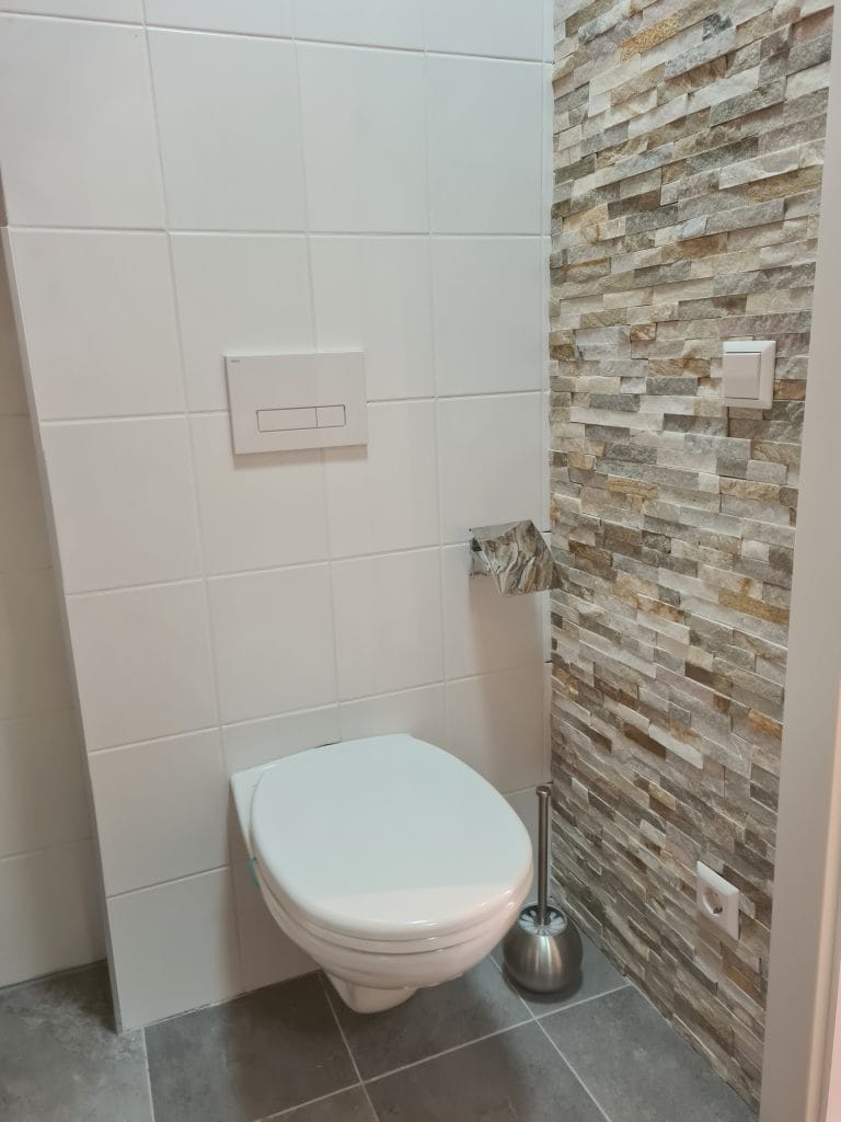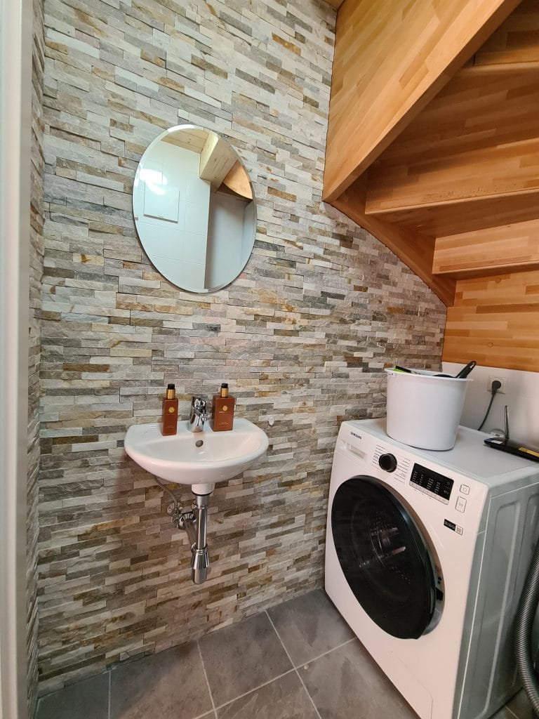 From the hallway you will find the laundry room with a washingmachine and dryer in one. The room also has a toilet and sink and where you will find the wifi router.