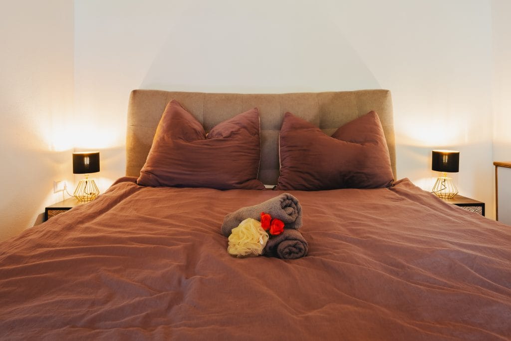 On the first floor you will find, on your left side, the master bedroom. It has a box spring, which is 2mX1.80m, a big closet for your clothes and an ensuite bathroom including a bath, toilet and sink.