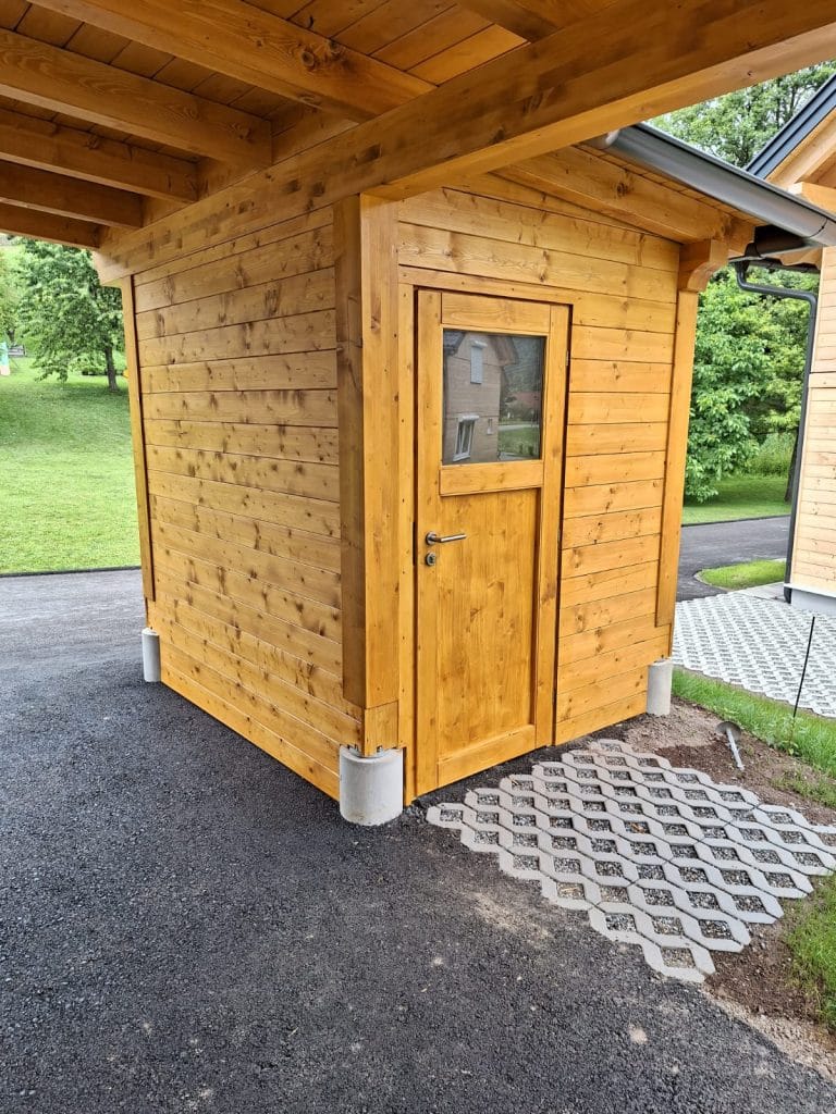 Outside you will find the storage room beneath the carport, where you can also park one car.